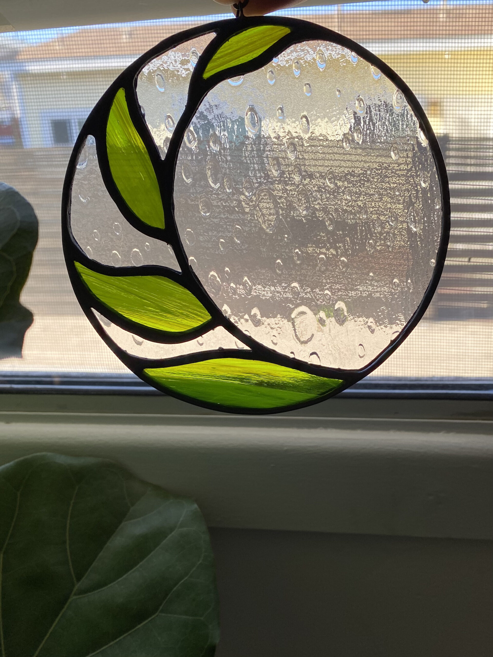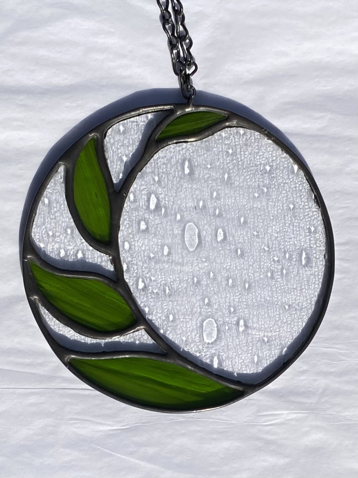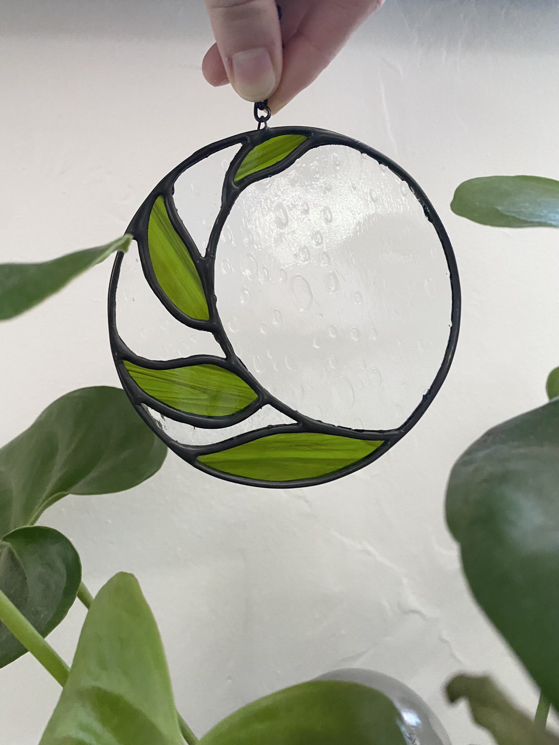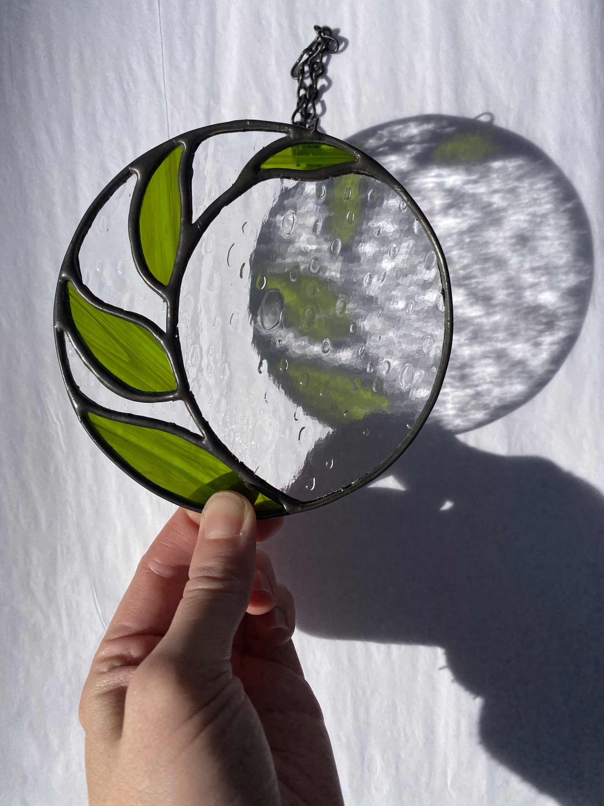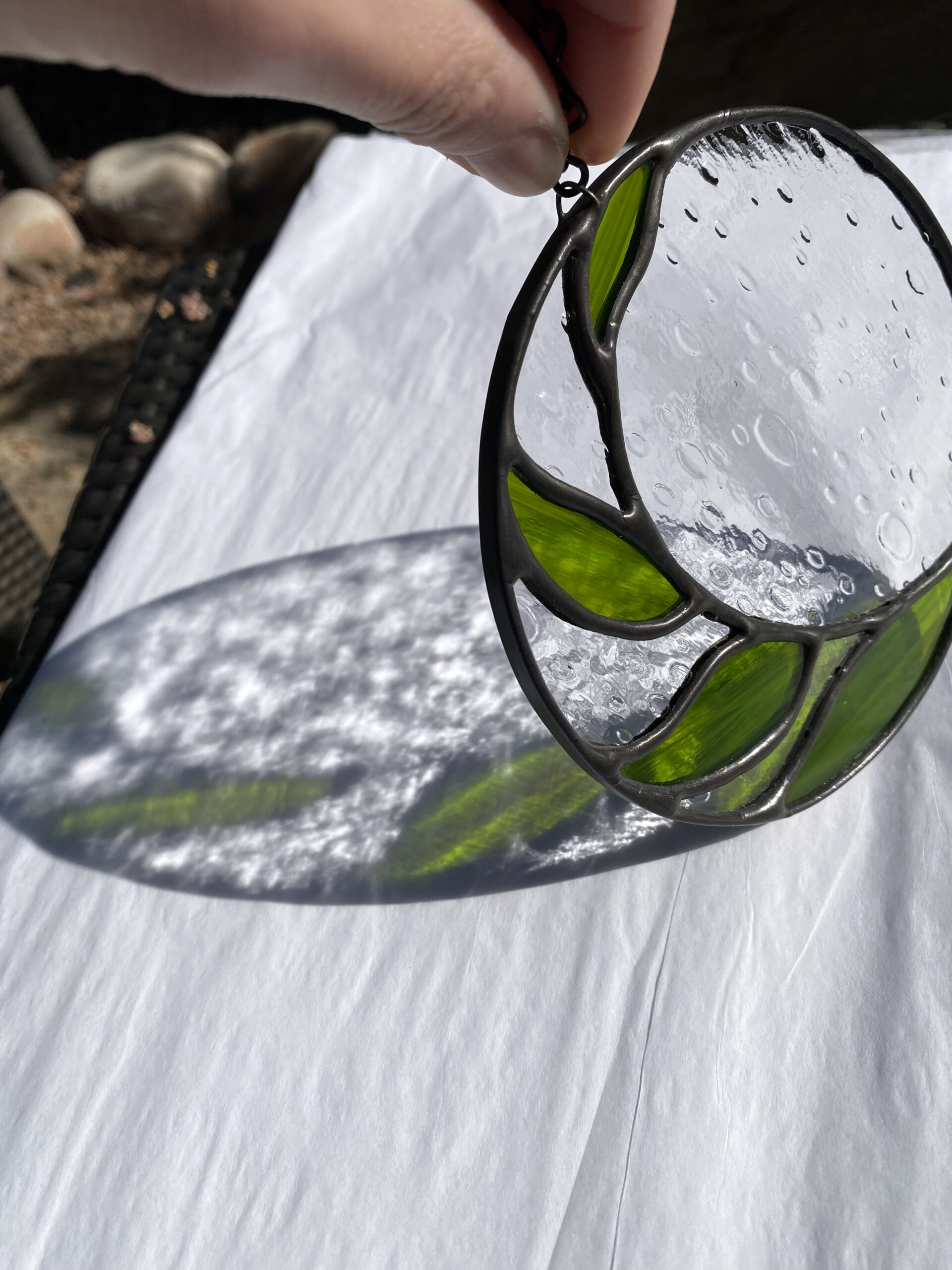 Consider this my love letter to the Pacific Northwest. These fern pieces are made with raindrop-textured clear, and semi-translucent green wispy glass. They’re finished with black patina and a black chain hanger.