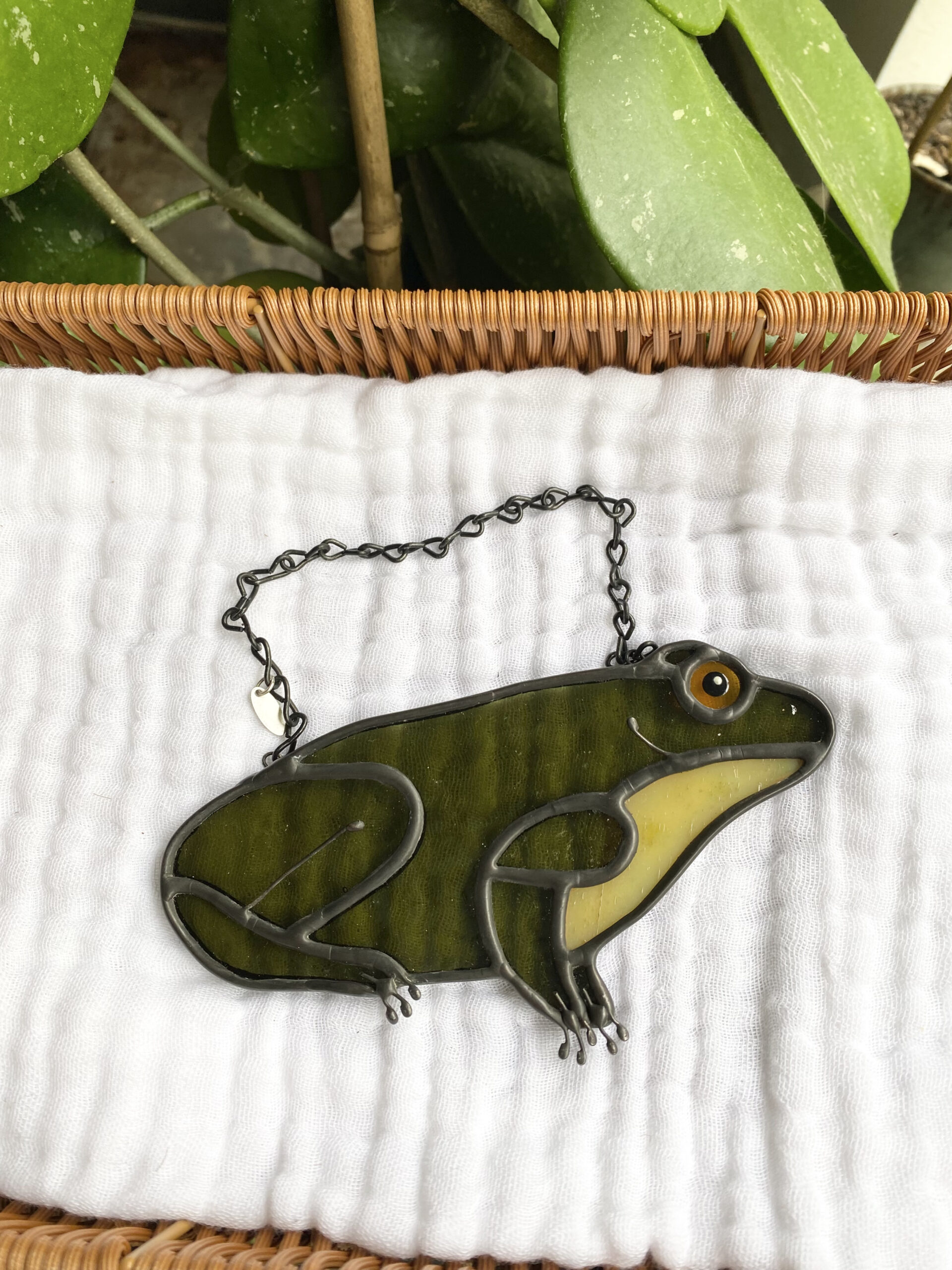 This frog would jump at the opportunity to be your friend! (See what I did there??) This piece is made with translucent amber, translucent textured olive green, and mostly-opaque mottled tan glass. It features a painted eye and wire details. It’s finished with black patina and a black hanging chain.