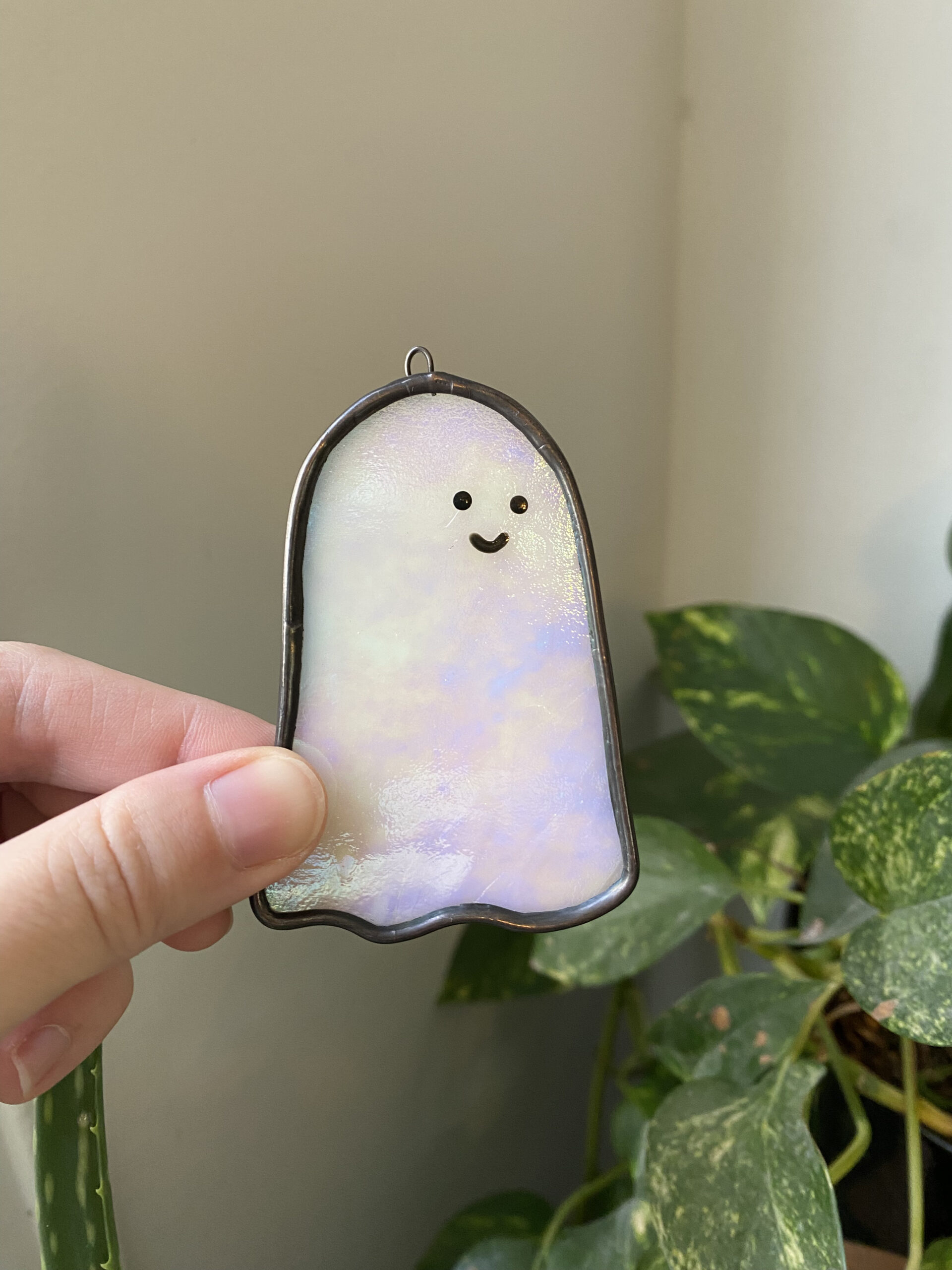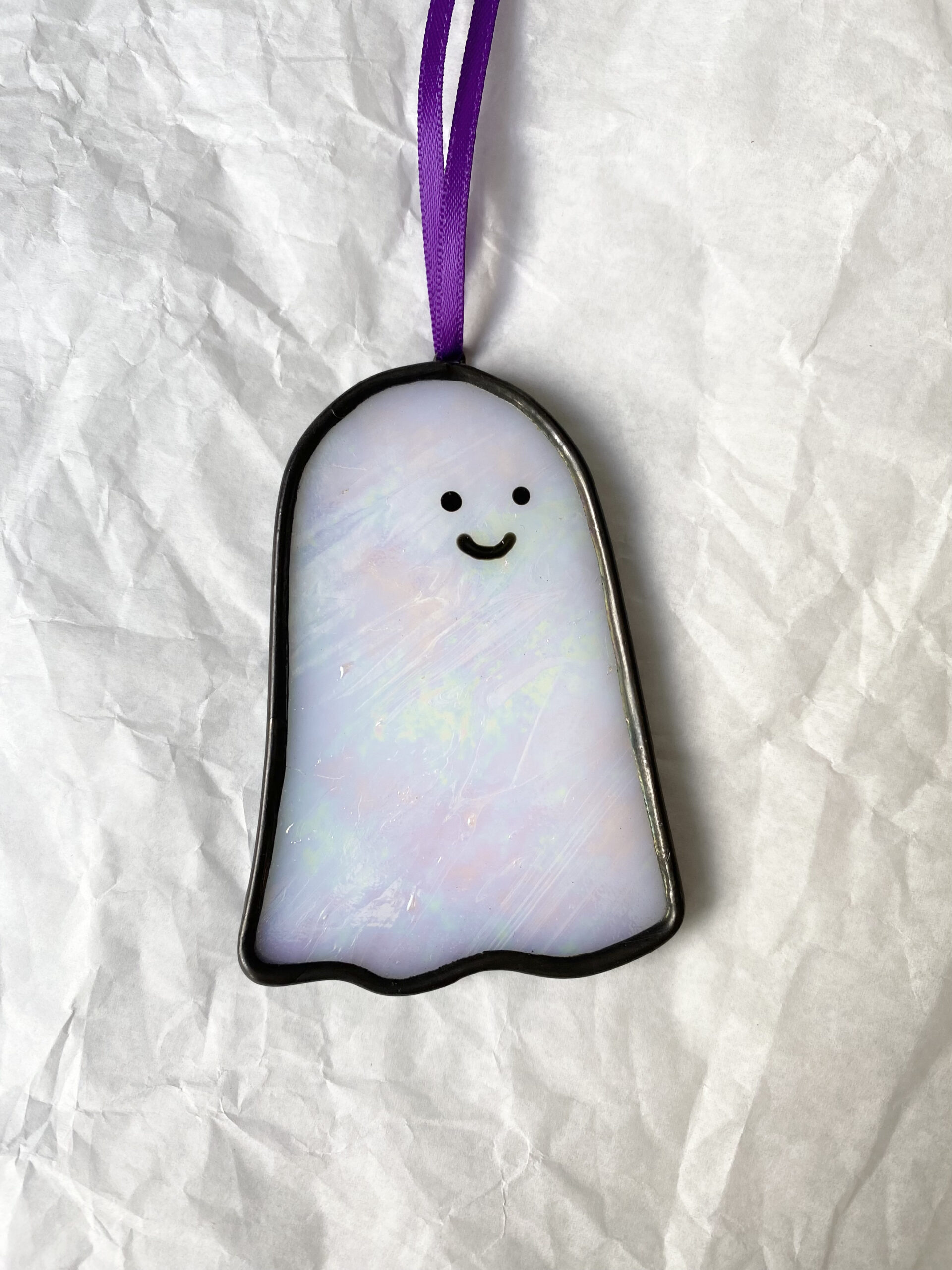 That is one friendly ghost! This piece is made with mostly-opaque white iridescent glass. It features hand painted face detail, and is finished with black patina and a ribbon hanger.