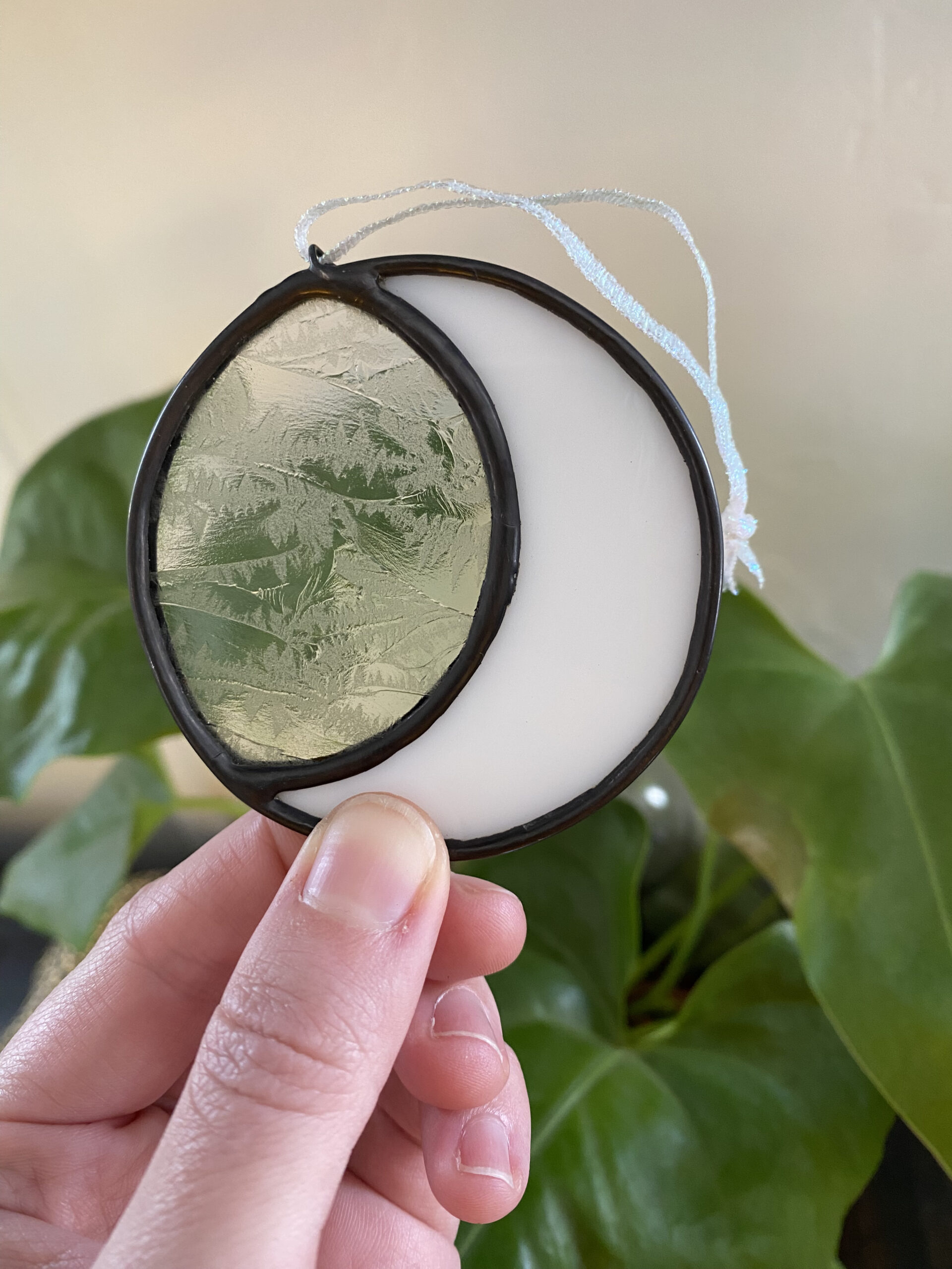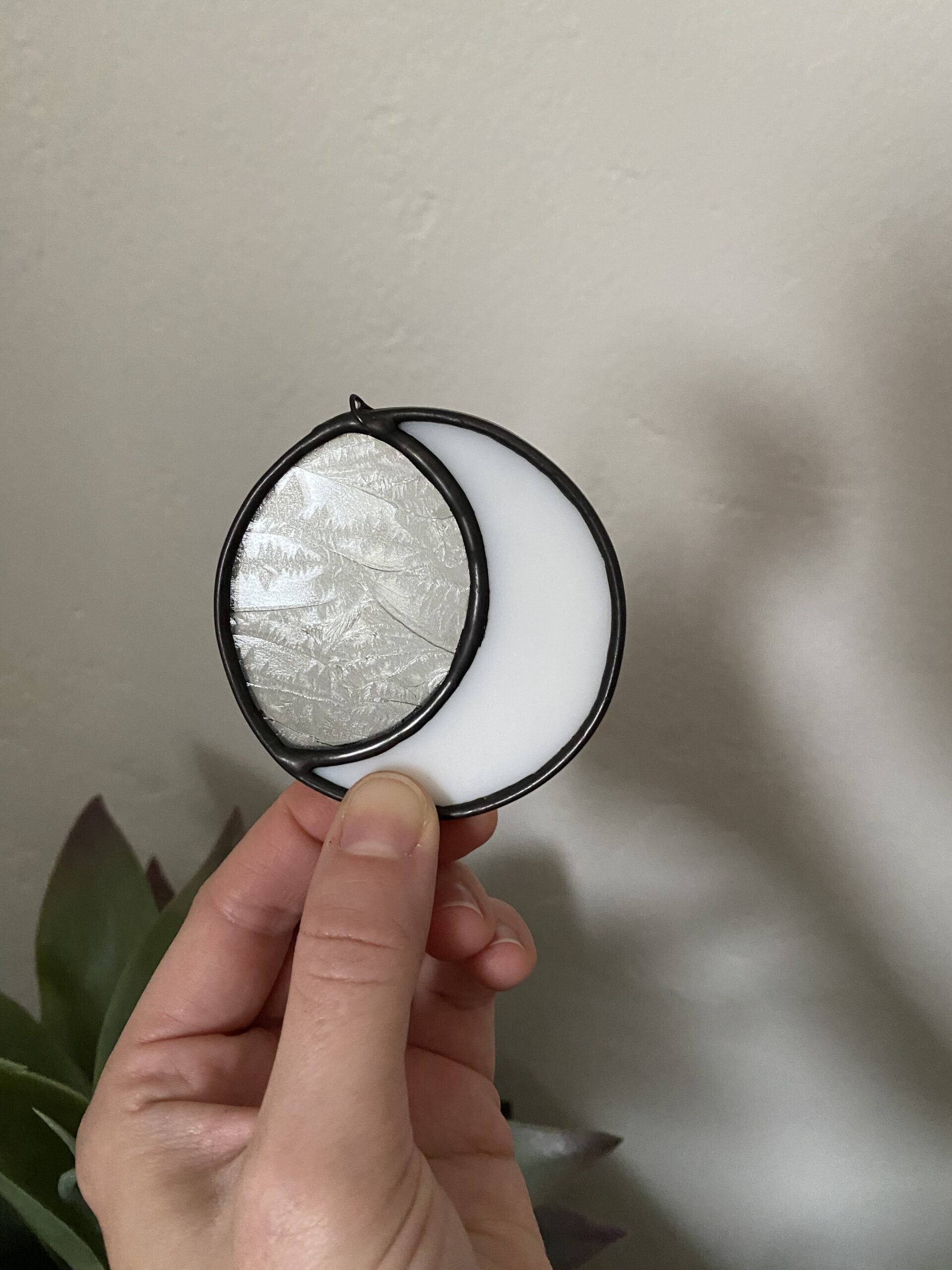 Brrrr, it’s going to be a chilly evening! This frosty moon is made with clear textured and mostly-opaque white glass. It’s finished with black patina and a sparkly white ribbon hanger.