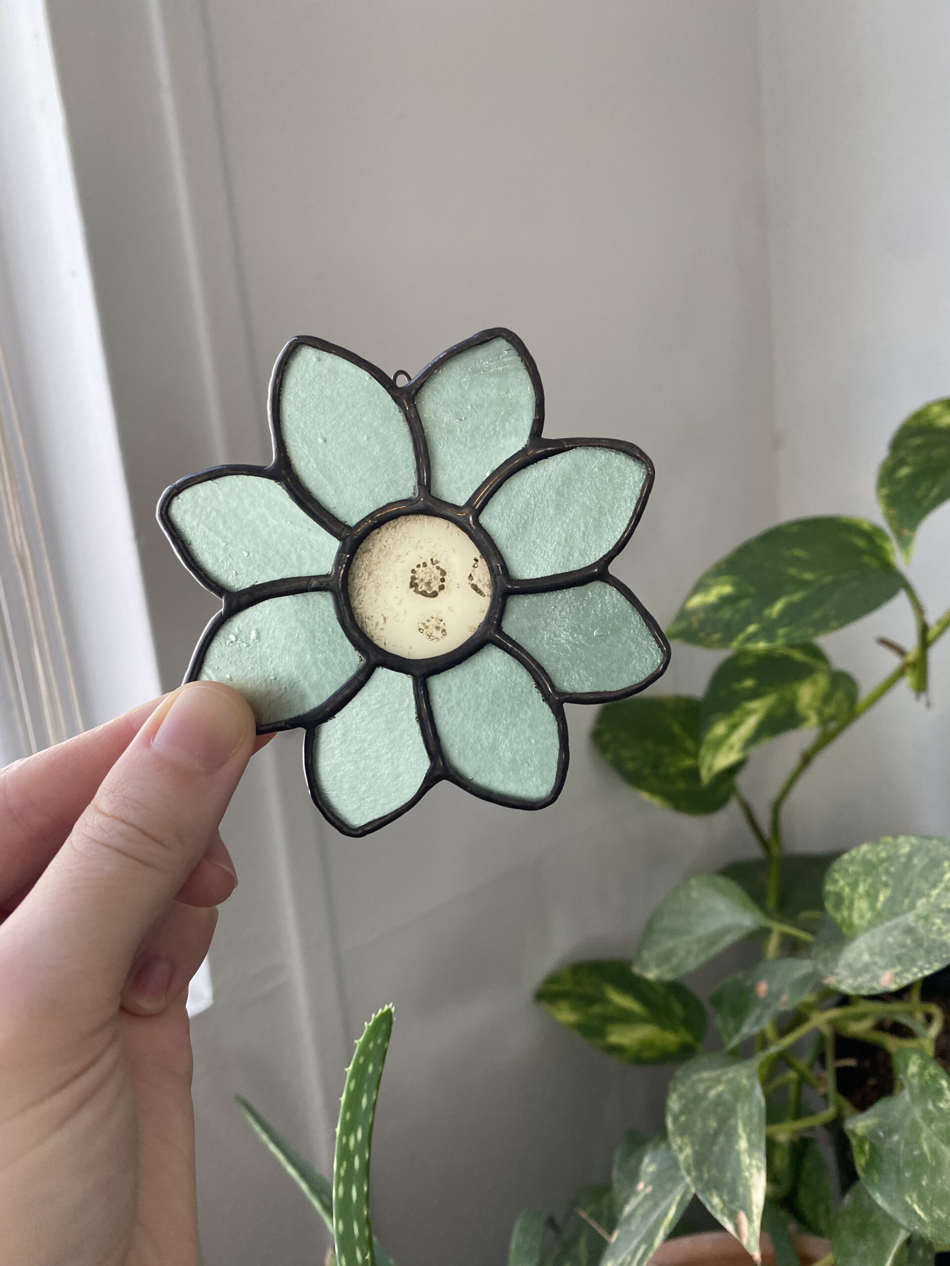 This flower is out of this world! This piece is made with semi-translucent jade green and mostly-opaque almond colored glass. It features hand painted moon details and is finished with black patina and a black chain hanger.
