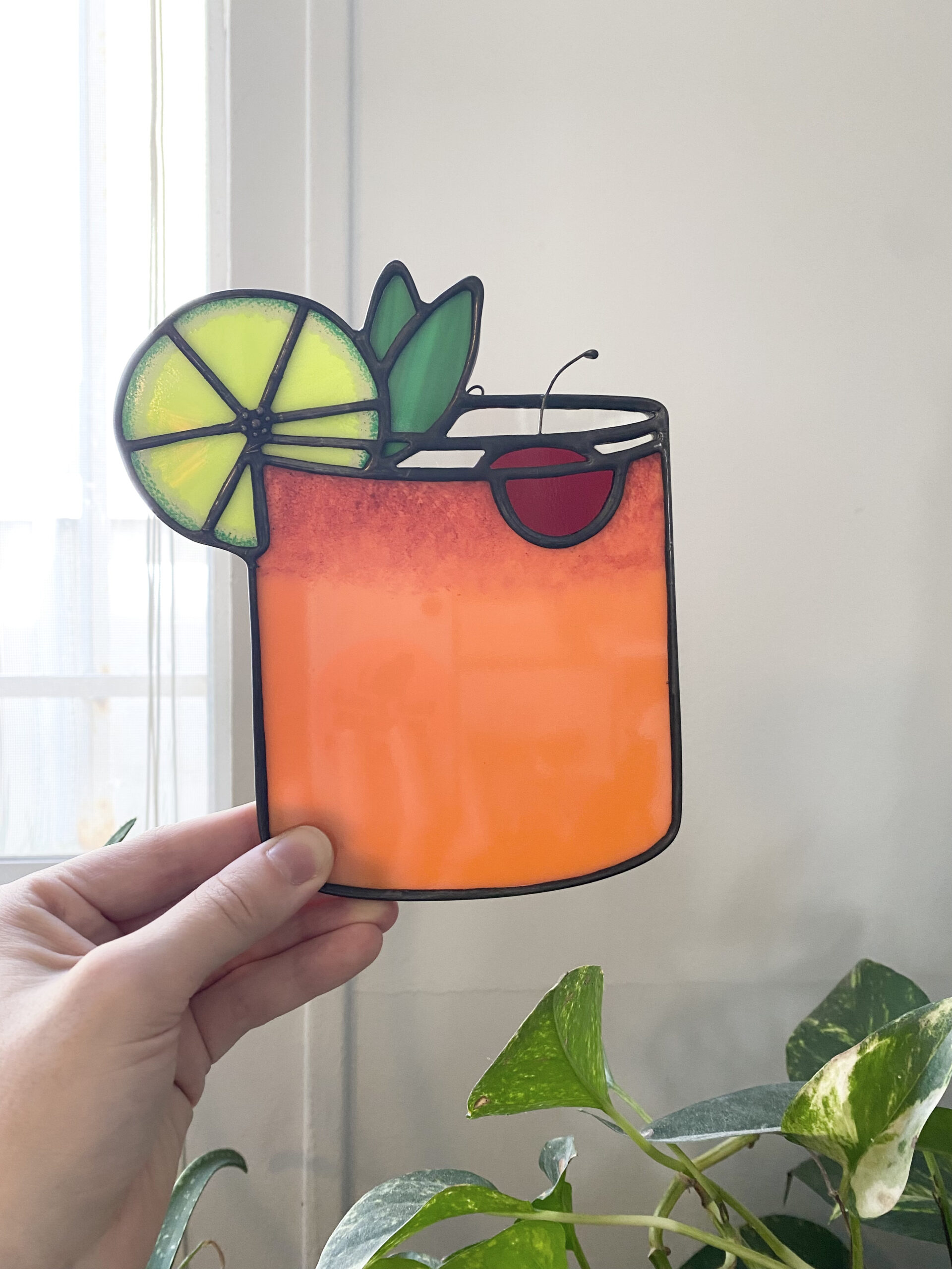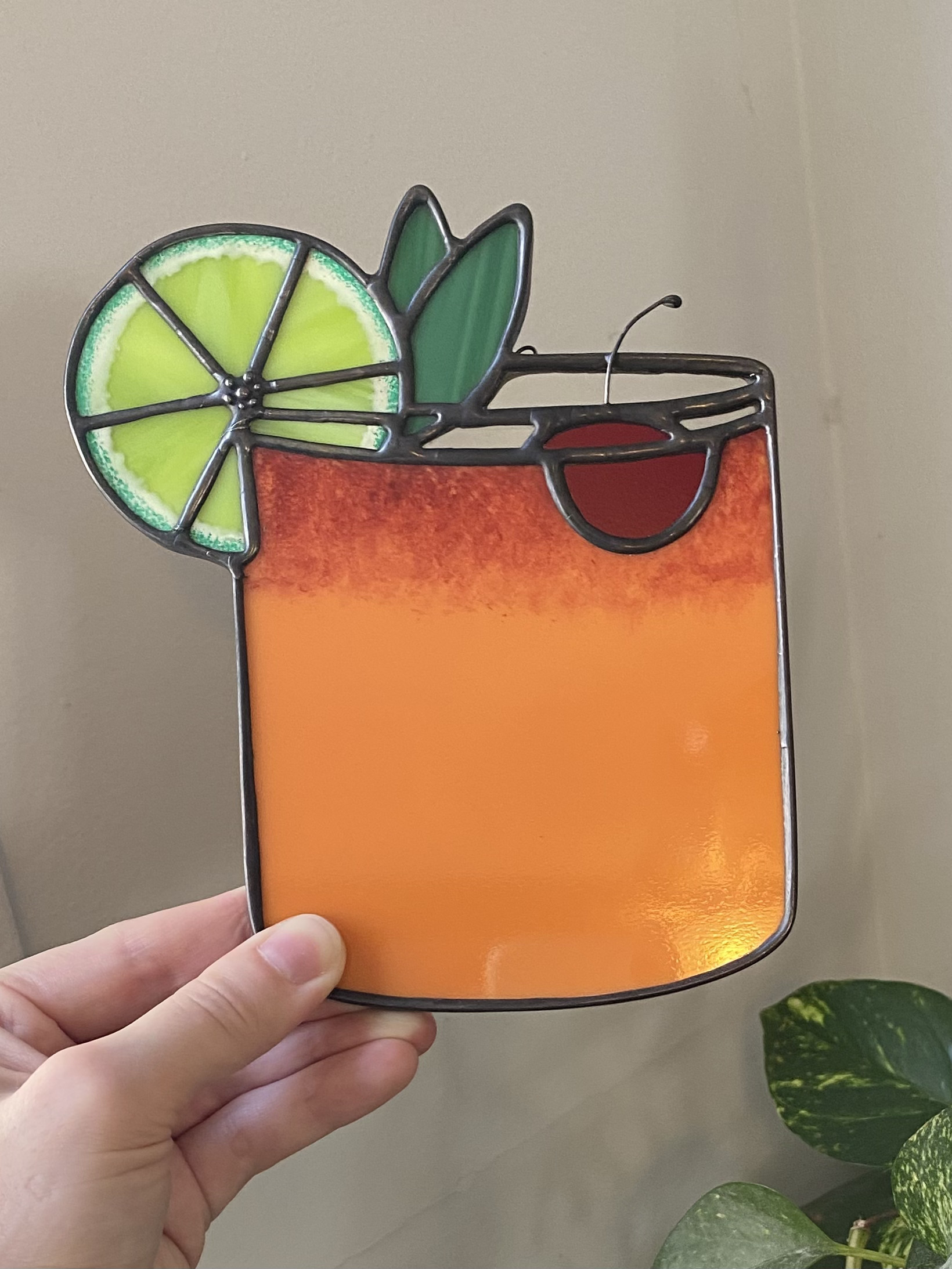 Mai tai? This is MY tai. Ok, ok…. if you really love it it’s all yours! This piece is made with opaque persimmon orange, opaque streaky light/dark green, translucent red, and clear glass. It features painted and wire details, and is finished with black patina and a black hanging chain.