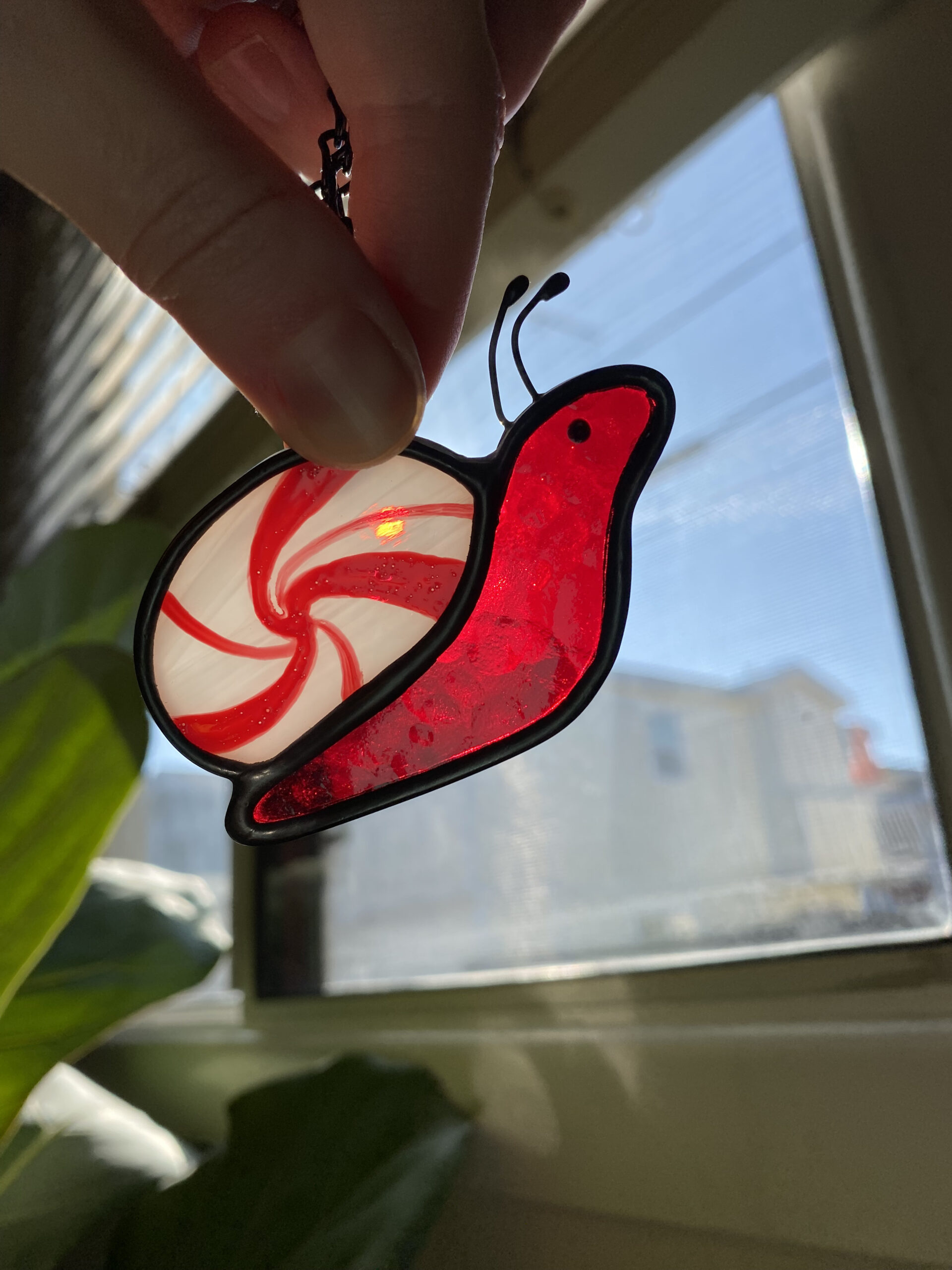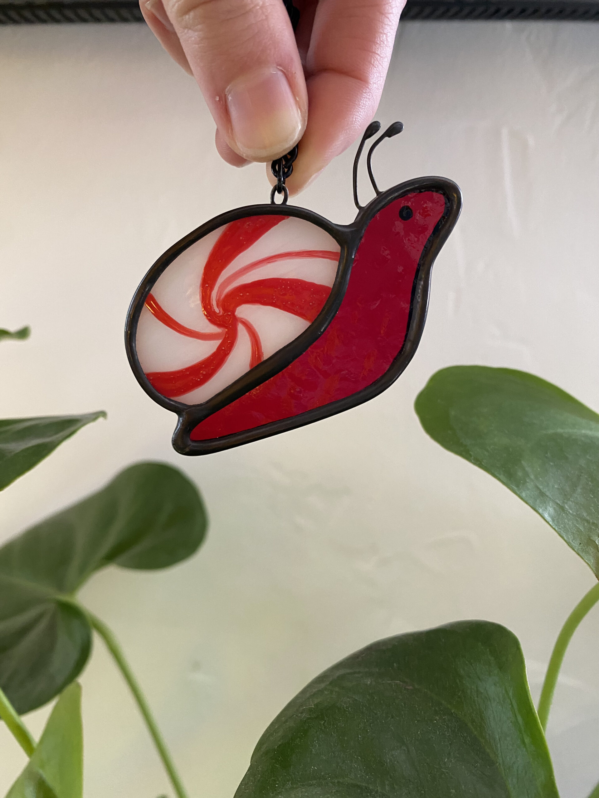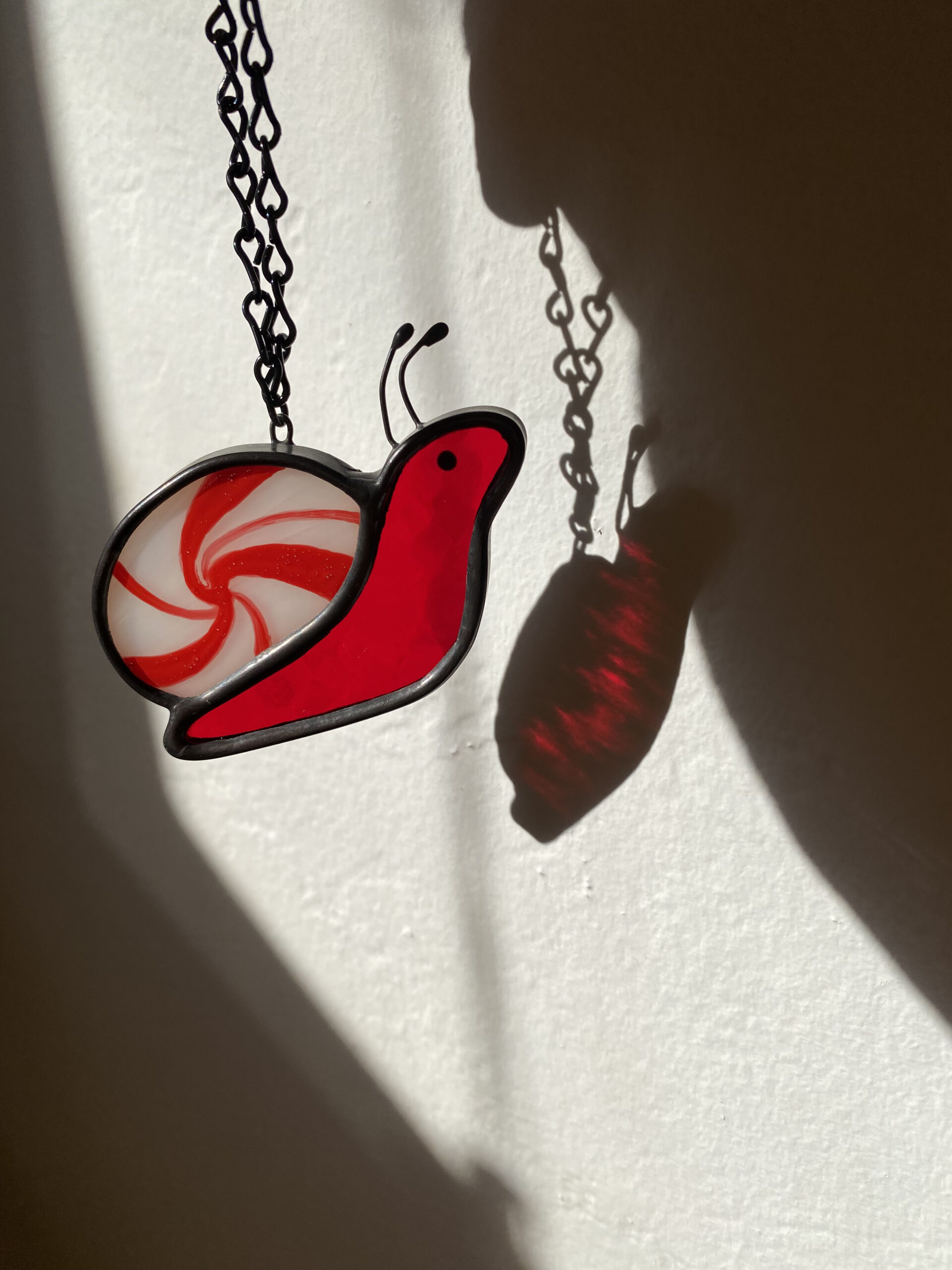 This little snail would jump at the chance to be your new BFF! (Well… it’ll actually glide slowly towards you. It is a snail, after all.) This piece is made with translucent textured red and mostly-opaque white wispy glass. It’s finished with wire details, a painted eye and peppermint swirl, black patina, and a black chain hanger.