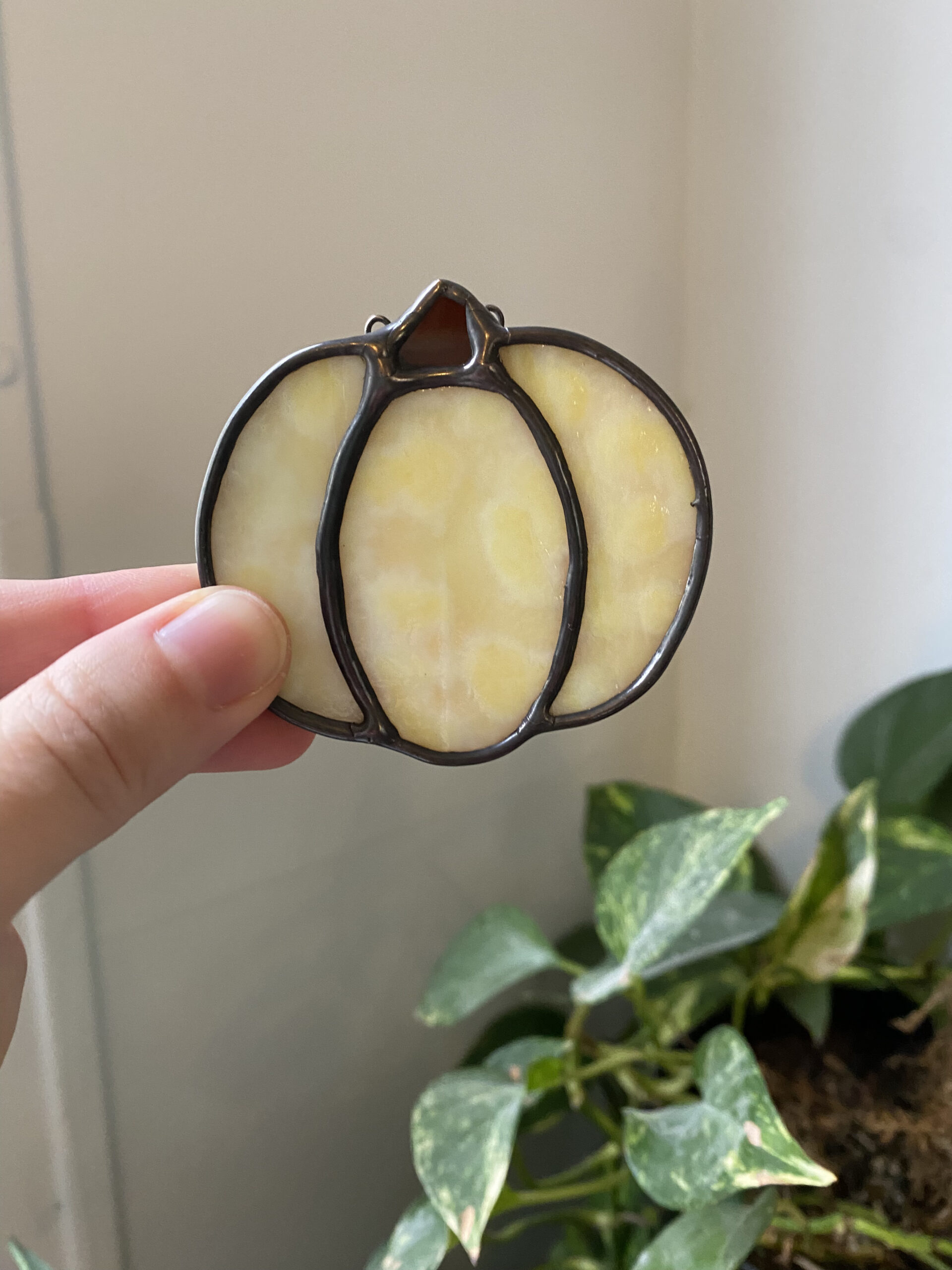 Pumpkins don’t have to be orange, variety is the spice of life! This pumpkin is made with mostly-opaque white mottled glass and semi-translucent brown streaky glass. It’s finished with black patina and a black hanging chain.