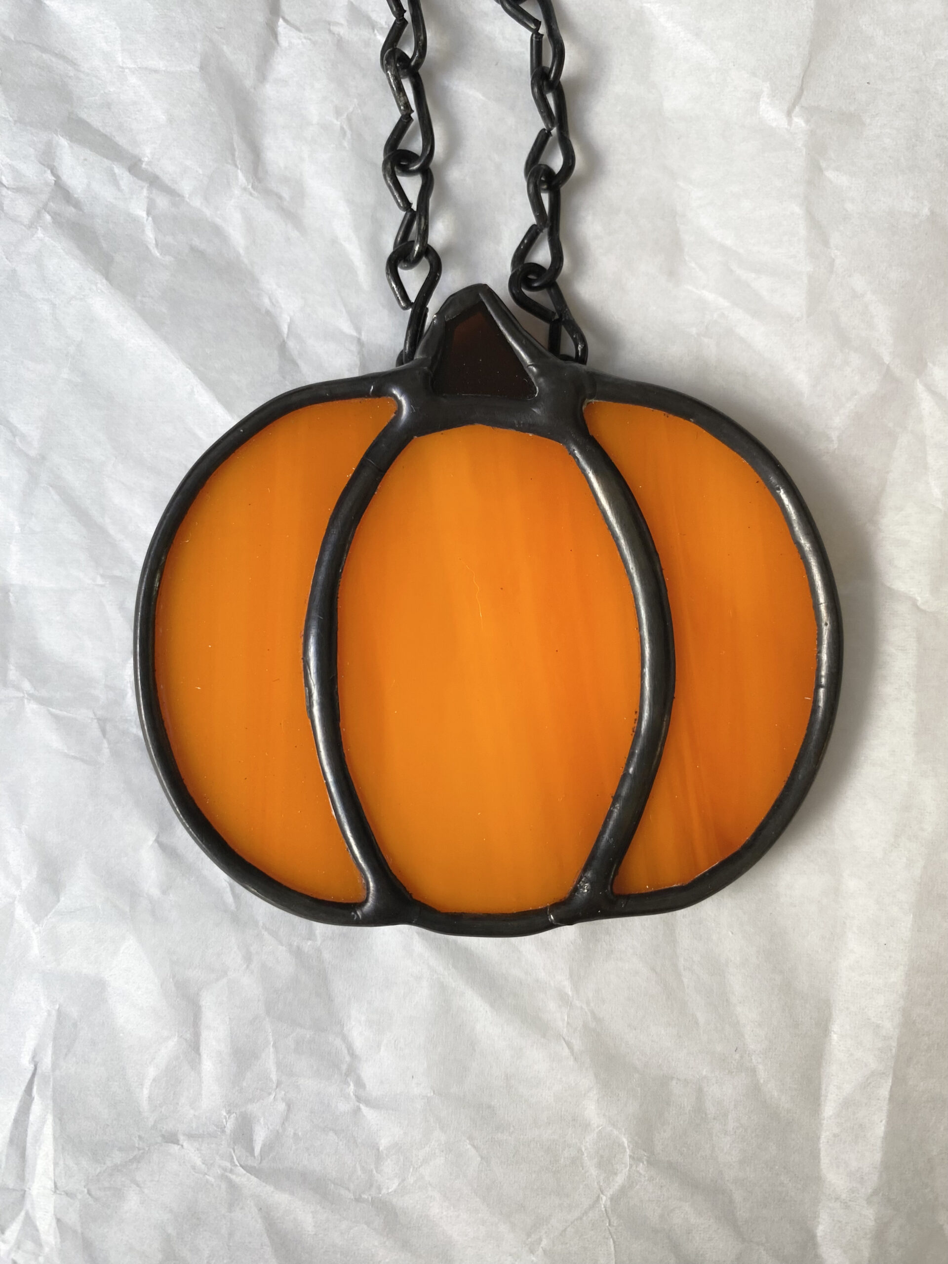 This classic orange pumpkin is the perfect pop of autumnal decor! This pumpkin is made with mostly-opaque orange streaky glass and semi-translucent brown streaky glass. It’s finished with black patina and a black hanging chain.