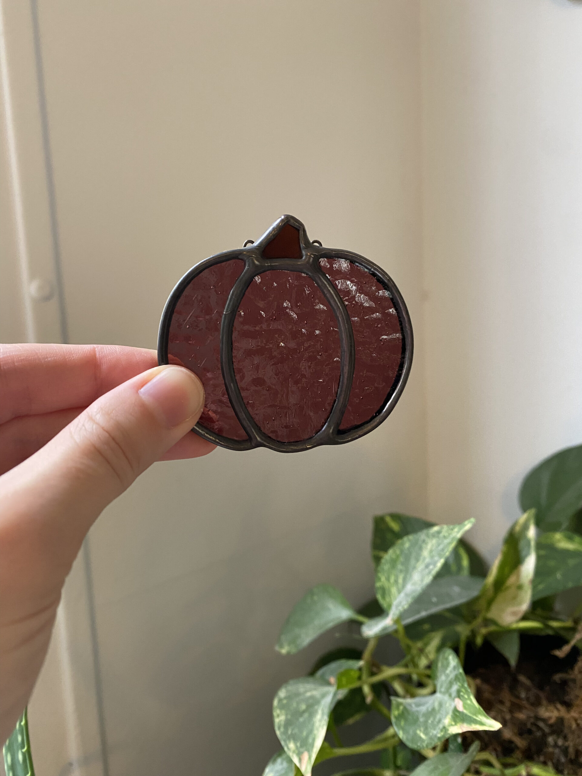 Pumpkins don’t have to be orange, variety is the spice of life! This pumpkin is made with textured translucent plum purple glass and semi-translucent brown streaky glass. It’s finished with black patina and a black hanging chain.